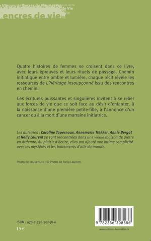 Quatre histoires de femmes se croisent dans ce livre, avec leurs épreuves et leurs rituels de passage. Chemin initiatique entre ombre et lumière, chaque récit révèle les ressources de l'héritage insoupçonné issu des rencontres en chemin. Ces écritures puissantes et singulières invitent à se relier aux forces de vie, que ce soit face au désir d'enfanter, à la naissance d'une première petite-fille, à l'annonce d'un cancer ou à la mort d'une marraine initiatrice.