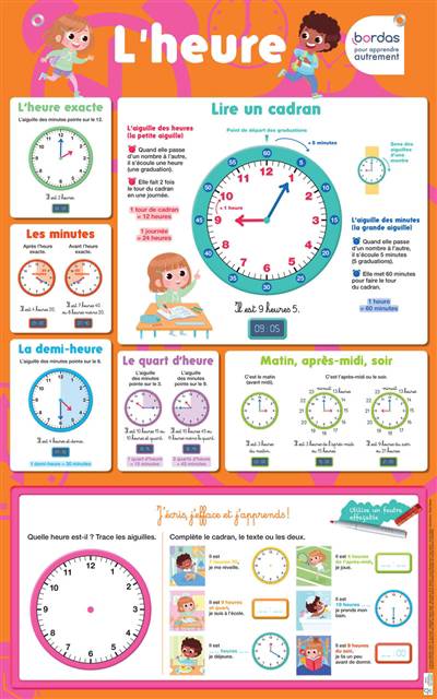 Grâce à ce poster effaçable retraçant les différents moments de la journée avec un graphisme coloré, l'enfant pourra apprendre à lire l'heure et à se repérer dans le temps. Chaque scène du quotidien, du lever au coucher en passant par le déjeuner, le goûter et le dîner, est propice à la lecture de l'heure sur le cadran des horloges. Seul ou aidé de ses parents, l'enfants dessine la grande et la petite aiguille sur les zones effaçables, sans craindre de se tromper car il peut recommencer à l'infini !