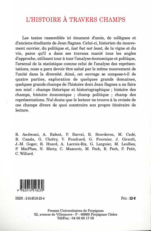 Les textes rassemblés ici émanent d'amis, de collègues et d'anciens étudiants de Jean Sagnes. Celui-ci, historien du mouvement ouvrier, du politique et, last but not least, de la vigne et du vin, parce qu'il a dans ses travaux manié tous les angles d'approche, utilisant tour à tour l'analyse économique et politique, l'arsenal de la statistique comme celui de l'analyse des représentations, nous a paru devoir être salué par le même mouvement de l'unité dans la diversité. Ainsi, cet ouvrage se compose-t-il de quatre parties, exploration de quelques grands domaines, quelques grands champs de l'histoire dont Jean Sagnes a su faire son miel : champs théorique et historiographique ; histoire des champs, histoire économique ; champ politique ; champ des représentations. Nul doute que le lecteur ne trouve à la croisée de ces champs divers de quoi construire son propre itinéraire de lecture.
