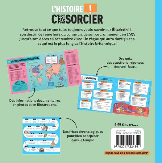 Un mix d'informations, de « Le sais-tu ? », d'« Incroyable mais vrai ! », de « Vrai ou faux », de jeux, de photos et d'illustrations pour découvrir le destin hors du commun d'Elizabeth Alexandra Mary, héritière des Windsor qui devient la reine Elisabeth II en 1952 à la mort de son père le roi George VI, couronnée en 1953 et, dont le règne aura duré 70 ans. De sa naissance en 1926 à son accession au trône jusqu'à son décès le 8 septembre 2022, la reine d'Angleterre, également chef du Commonwealth et de l'Église anglicane d'Angleterre, n'aura eu de cesse de placer son règne avant toute chose et de rayonner dans le monde entier.