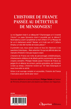 L’histoire de France est riche de personnages emblématiques, d’événements célèbres et de détails parfois surprenants que nous croyons connaître. Philippe Valode passe l’histoire de France au peigne fin et détecte les erreurs, parfois grossières, qui résistent si bien au temps. L’historien revient sur 131 faits historiques et nous livre enfin la vérité.