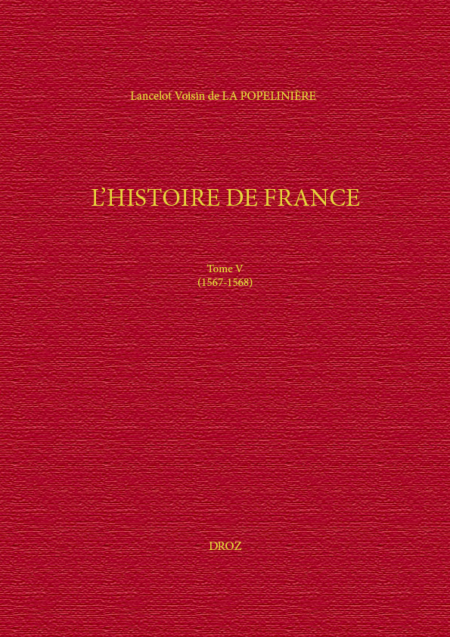 Le volume V regroupe les livres 11, 12 et 13 de L’Histoire de France. Il traite de la deuxième guerre civile, de la surprise de Meaux (26-28 septembre 1567) à la paix de Longjumeau confirmée par l’octroi de l’édit de Paris du 23 mars 1568. Il inclut les batailles de St-Denis et de Cognat, ainsi que le siège de Chartres. Comme à son habitude, l’auteur déborde largement du seul cas français en insérant des paragraphes sur les affaires des pays voisins. Cependant, deux éléments sont à noter. D’une part les trois livres du présent volume sont les trois premiers livres de La Vraye et entière histoire dans sa version de 1572. Ceci permet d’établir des comparaisons en vue de faire apparaître le travail de recomposition auquel se sont livrés l’auteur et l’éditeur. D’autre part, le « narré » des combats livrés en Poitou et Aunis sont de première main puisque La Popelinière, enfant du pays, a participé à ces affrontements. La combinaison de ces deux facteurs renforce la tonalité personnelle du récit.
