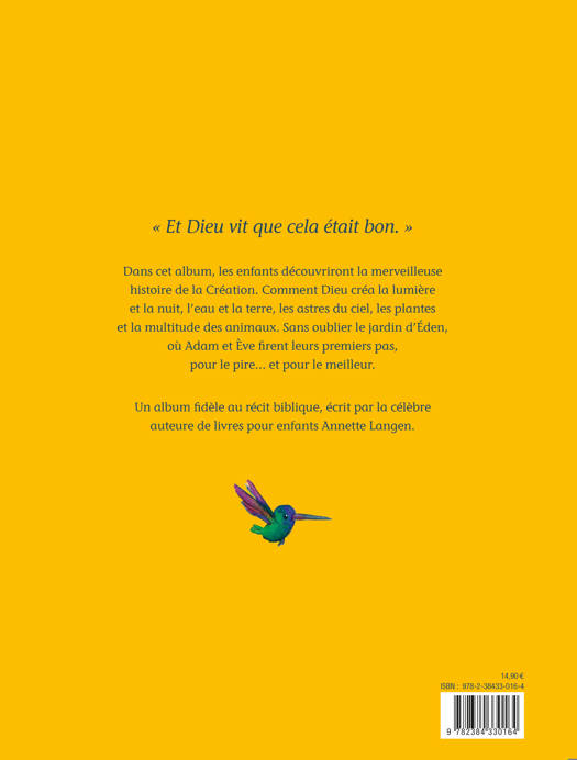 « Et Dieu vit que cela était bon. » Un superbe album magnifiquement illustré pour raconter aux plus petits le récit de la Création d’une manière vivante, incarnée et fidèle à la Bible. Sept jours pendant lesquels Dieu a créé le jour et la nuit, l’eau et la terre, les plantes et les animaux sans oublier l’histoire d’Adam et Ève au jardin d’Éden. Le premier des albums bibliques de la célèbre auteure de livres pour enfants Annette Langen, enfin traduit en français, et magnifiquement illustré par Marina Hoffmann. À partir de 3 ans.v