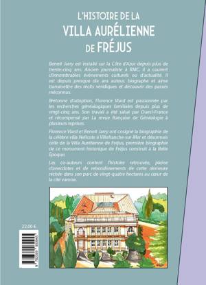 Benoit Jarry est installé sur la Côte d’Azur depuis plus de trente-cinq ans. Ancien journaliste à RMC, <br /><br /> il a couvert d’innombrables évènements culturels ou d’actualité. Il est depuis presque dix ans auteur, biographe et aime transmettre des récits véridiques et découvrir des passés méconnus.<br /><br /> Bretonne d’adoption, Florence Viard est passionnée par les recherches généalogiques familiales depuis plus de vingt-cinq ans. Son travail a été salué par Ouest-France et récompensé par La revue française de Généalogie à plusieurs reprises.<br /><br /> Florence Viard et Benoit Jarry ont cosigné la biographie de la célèbre villa Nellcote à Villefranche-sur-Mer et désormais celle de la Villa Aurélienne de Fréjus, première biographie de ce monument historique de Fréjus construit à la Belle Époque.<br /><br /> Les co-auteurs content l’histoire retrouvée, pleine d’anecdotes et de rebondissements de cette demeure nichée dans son parc de vingt-quatre hectares au coeur de la cité varoise.<br /><br /> Les parcours hors du commun des différents propriétaires de cette somptueuse villa Aurélienne ont été si riches, qu'au fil du siècle dernier, ils ont construit leurs propres histoires passionnantes. Nous leur devons au minimum ce devoir de mémoire collectif.