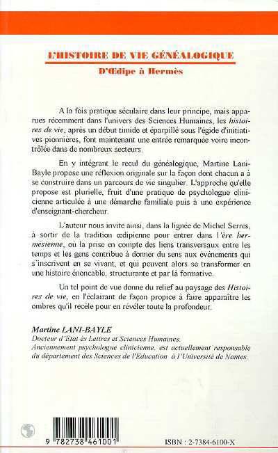 Martine Lani-Bayle propose une réflexion originale sur la façon dont chacun a à se construire dans un parcours de vie singulier. L'approche qu'elle propose est plurielle, fruit d'une pratique de psychologue clinicienne articulée à une démarche familiale puis à une expérience d'enseignant-chercheur. L'auteur nous invite ainsi, dans la lignée de Michel Serres, à sortir de la tradition oedipienne pour entrer dans l'ère hérmésienne, où la prise en compte des liens transversaux entre les temps et les gens contribue à donner du sens aux événements qui s'inscrivent en se vivant, et qui peuvent alors se transformer en une histoire énonçable, structurante et par là formative.