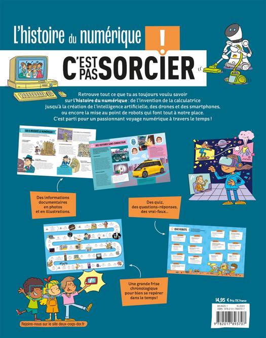 Un mix d'informations, de quiz, de chiffres clés, d'activités, de photos et d'illustrations sur l'Histoire du numérique et des nouvelles technologies dans le monde au fil des siècles jusqu'à nos jours. 96 pages structurées en 5 grandes parties qui explorent les événements-clés, les personnages marquants, les découvertes, les inventions et les évolutions de société. De nombreuses rubriques animent les doubles pages : Vrai ou faux ; Le sais-tu ? ; Incroyable mais vrai... À la fin de chaque chapitre, un quiz permet de tester ses connaissances en s'amusant. Et pour aider l'enfant à se repérer dans le temps, une frise chronologique vient compléter l'ouvrage. Une première approche moderne et ludique du monde numérique avec C'est pas sorcier !