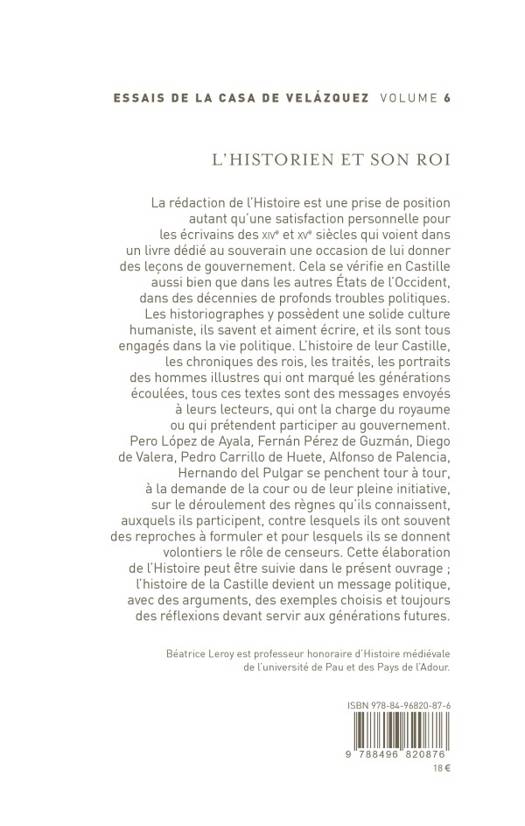 La rédaction de l'Histoire est une prise de position autant qu'une satisfaction personnelle pour les écrivains des XIVe et XVe siècles qui voient dans un livre dédié au souverain une occasion de lui donner des leçons de gouvernement. Cela se vérifie en Castille aussi bien que dans les autres États de l'Occident, dans des décennies de profonds troubles politiques. Les historiographes y possèdent une solide culture humaniste, ils savent et aiment écrire, et ils sont tous engagés dans la vie politique. L'histoire de leur Castille, les chroniques des rois, les traités, les portraits des hommes illustres qui ont marqué les générations écoulées, tous ces textes sont des messages envoyés à leurs lecteurs, qui ont la charge du royaume ou qui prétendent participer au gouvernement. Pero López de Ayala, Fernán Pérez de Guzmán, Diego de Valera, Pedro Carrillo de Huete, Alfonso de Palencia, Hernando del Pulgar se penchent tour à tour, à la demande de la cour ou de leur pleine initiative, sur le déroulement des règnes qu'ils connaissent, auxquels ils participent, contre lesquels ils ont souvent des reproches à formuler et pour lesquels ils se donnent volontiers le rôle de censeurs. Cette élaboration de l'Histoire peut être suivie dans le présent ouvrage ; l'histoire de la Castille devient un message politique, avec des arguments, des exemples choisis et toujours des réflexions devant servir aux générations futures.