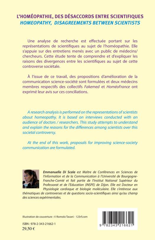 Une analyse de recherche est effectuée portant sur les représentations de scientifiques au sujet de l'homéopathie. Elle s'appuie sur des entretiens menés avec un public de médecins / chercheurs. Cette étude tente de comprendre et d'expliquer les raisons des divergences entre les scientifiques au sujet de cette controverse sociétale. À l'issue de ce travail, des propositions d'amélioration de la communication science-société sont formulées et deux médecins membres respectifs des collectifs Fakemed et HoméoFrance ont exprimé leur avis sur ces conciliations. Edition bilingue (français-anglais).