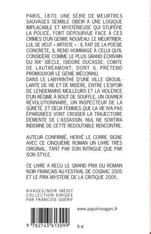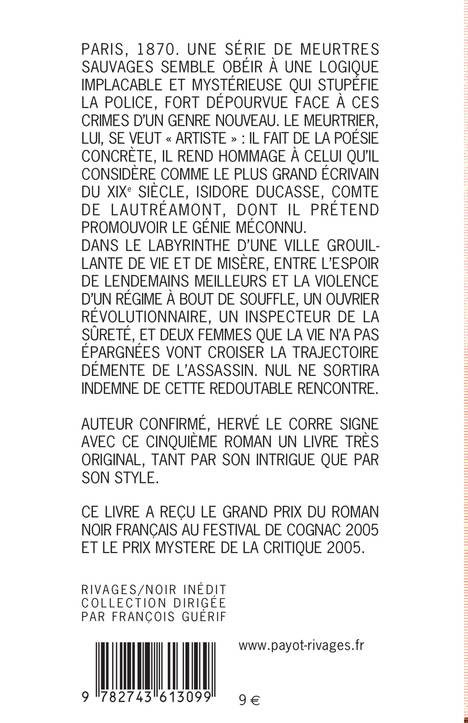 Paris, 1870. Une série de meurtres sauvages semble obéir à une logique implacable et mystérieuse qui stupéfié la police, fort dépourvue face à ces crimes d'un genre nouveau. Le meurtrier, lui, se veut « artiste » : il fait de la poésie concrète, il rend hommage a celui qu'il considère comme le plus grand écrivain du XIXe siècle, Isidore Ducasse, comte de Lautréamont, dont il prétend promouvoir le génie méconnu. Dans le labyrinthe d'une ville grouillante de vie et de misère, entre l'espoir de lendemains meilleurs et la violence d'un régime à bout de souffle, un ouvrier révolutionnaire, un inspecteur de la sûreté, et deux femmes que la vie n'a pas épargnées vont croiser la trajectoire démente de l'assassin. Nul ne sortira indemne de cette redoutable rencontre. Auteur confirmé, Hervé Le Corre
