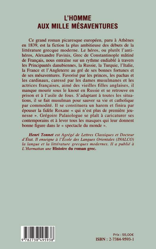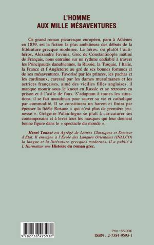 Ce grand roman picaresque européen, paru à Athènes en 1839, est la fiction la plus ambitieuse des débuts de la littérature grecque moderne. Le héros, ou plutôt l'antihéros, Alexandre Favinis, Grec de Constantinople mâtiné de Français, nous entraîne sur un rythme endiablé à travers les principautés danubiennes, la Russie, la Turquie, l'Italie, la France et l'Angleterre au gré de ses bonnes fortunes et de ses mésaventures.
