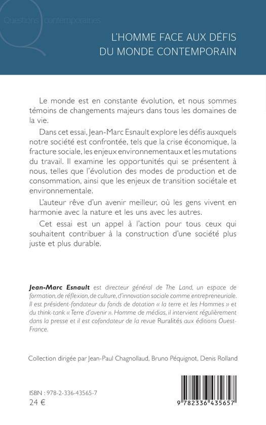 Dans cet essai, Jean-Marc Esnault explore les défis auxquels notre société est confrontée, tels que la crise économique, la fracture sociale, les enjeux environnementaux et les mutations du travail. Il examine les opportunités qui se présentent à nous, telles que l’évolution des modes de production et de consommation, ainsi que les enjeux de transition sociétale et environnementale.