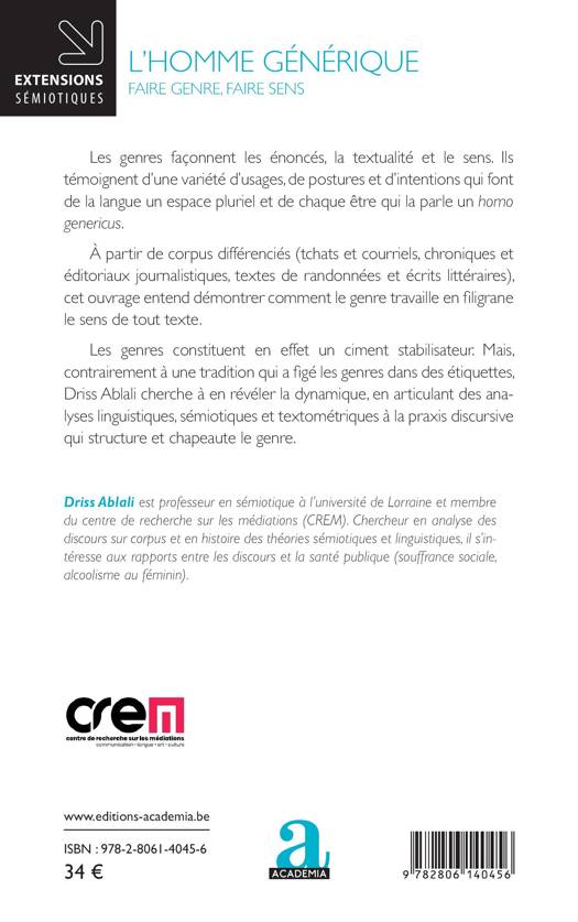 Les genres façonnent les énoncés, la textualité et le sens. Ils témoignent d'une variété d'usages, de postures et d'intentions qui font de la langue un espace pluriel et de chaque être qui la parle un homo genericus. À partir de corpus différenciés (tchats et courriels, chroniques et éditoriaux journalistiques, textes de randonnées et écrits littéraires), cet ouvrage entend démontrer comment le genre travaille en filigrane le sens de tout texte. Les genres constituent en effet un ciment stabilisateur. Mais, contrairement à une tradition qui a figé les genres dans des étiquettes, Driss Ablali cherche plutôt à en révéler la dynamique, en articulant des analyses linguistiques, sémiotiques et textométriques à la praxis discursive qui structure et chapeaute le genre.