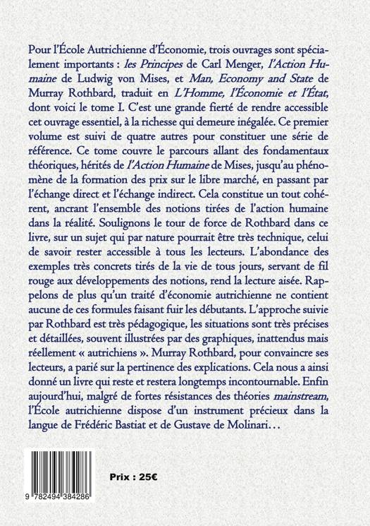 Pour l'École Autrichienne d'Économie, trois ouvrages sont spécialement importants : les Principes de Carl Menger, l'Action Humaine de Ludwig von Mises, et Man, Economy and State de Murray Rothbard, traduit en L'Homme, l'Économie et l'État, dont voici le tome I. C'est une grande fierté de rendre accessible cet ouvrage essentiel, à la richesse qui demeure inégalée. Ce premier volume est suivi de quatre autres pour constituer une série de référence. Ce tome couvre le parcours allant des fondamentaux théoriques, hérités de l'Action Humaine de Mises, jusqu'au phénomène de la formation des prix sur le libre marché, en passant par l'échange direct et l'échange indirect. Cela constitue un tout cohérent, ancrant l'ensemble des notions tirées de l'action humaine dans la réalité. Soulignons le tour de force de Rothbard dans ce livre, sur un sujet qui par nature pourrait être très technique, celui de savoir rester accessible à tous les lecteurs. L'abondance des exemples très concrets tirés de la vie de tous jours, servant de fil rouge aux développements des notions, rend la lecture aisée. Rappelons de plus qu'un traité d'économie autrichienne ne contient aucune de ces formules faisant fuir les débutants. L'approche suivie par Rothbard est très pédagogique, les situations sont très précises et détaillées, souvent illustrées par des graphiques, inattendus mais réellement «autrichiens». Murray Rothbard, pour convaincre ses lecteurs, a parié sur la pertinence des explications. Cela nous a ainsi donné un livre qui reste et restera longtemps incontournable. Enfin aujourd'hui, malgré de fortes résistances des théories mainstream, l'École autrichienne dispose d'un instrument précieux dans la langue de Frédéric Bastiat et de Gustave de Molinari...