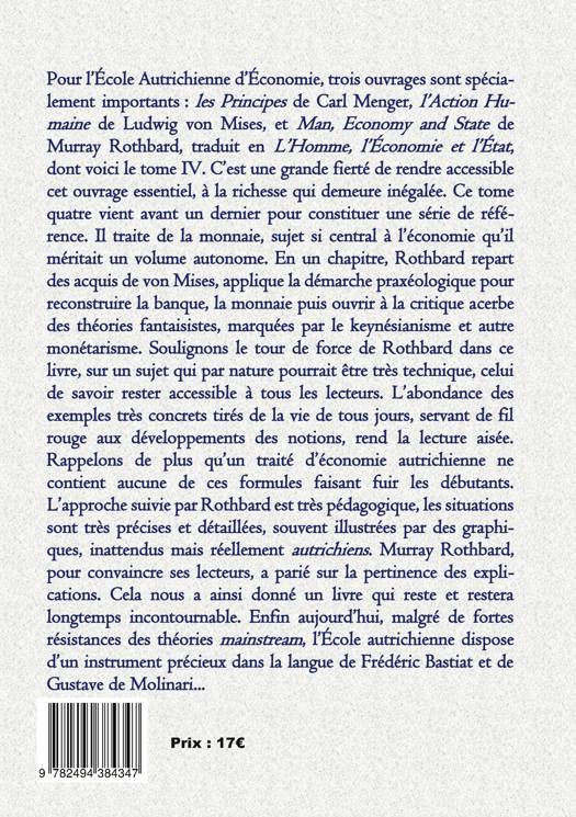 Pour l'École Autrichienne d'Économie, trois ouvrages sont spécialement importants : les Principes de Carl Menger, l'Action Humaine de Ludwig von Mises, et Man, Economy and State de Murray Rothbard, traduit en L'Homme, l'Économie et l'État, dont voici le tome IV. C'est une grande fierté de rendre accessible cet ouvrage essentiel, à la richesse qui demeure inégalée. Ce tome quatre vient avant un dernier pour constituer une série de référence. Il traite de la monnaie, sujet si central à l'économie qu'il méritait un volume autonome. En un chapitre, Rothbard repart des acquis de von Mises, applique la démarche praxéologique pour reconstruire la banque, la monnaie puis ouvrir à la critique acerbe des théories fantaisistes, marquées par le keynésianisme et autre monétarisme. Soulignons le tour de force de Rothbard dans ce livre, sur un sujet qui par nature pourrait être très technique, celui de savoir rester accessible à tous les lecteurs. L'abondance des exemples très concrets tirés de la vie de tous jours, servant de fil rouge aux développements des notions, rend la lecture aisée. Rappelons de plus qu'un traité d'économie autrichienne ne contient aucune de ces formules faisant fuir les débutants. L'approche suivie par Rothbard est très pédagogique, les situations sont très précises et détaillées, souvent illustrées par des graphiques, inattendus mais réellement « autrichiens ». Murray Rothbard, pour convaincre ses lecteurs, a parié sur la pertinence des explications. Cela nous a ainsi donné un livre qui reste et restera longtemps incontournable. Enfin aujourd'hui, malgré de fortes résistances des théories mainstream, l'École autrichienne dispose d'un instrument précieux dans la langue de Frédéric Bastiat et de Gustave de Molinari...