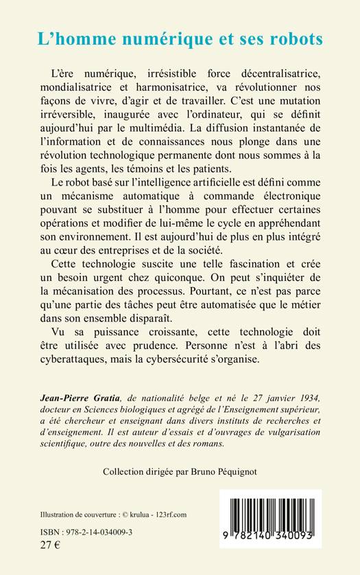 L'ère numérique, irrésistible force décentralisatrice, mondialisatrice et harmonisatrice, va révolutionner nos façons de vivre, d'agir et de travailler. C'est une mutation irréversible, inaugurée avec l'ordinateur, qui se définit aujourd'hui par le multimédia. La diffusion instantanée de l'information et de connaissances nous plonge dans une révolution technologique permanente dont nous sommes à la fois les agents, les témoins et les patients. Le robot basé sur l'intelligence artificielle est défini comme un mécanisme automatique à commande électronique pouvant se substituer à l'homme pour effectuer certaines opérations et modifier de lui-même le cycle en appréhendant son environnement. Il est aujourd'hui de plus en plus intégré au cur des entreprises et de la société. Cette technologie suscite une telle fascination et crée un besoin urgent chez quiconque. On peut s'inquiéter de la mécanisation des processus. Pourtant, ce n'est pas parce qu'une partie des tâches peut être automatisée que le métier dans son ensemble disparaît. Vu sa puissance croissante, cette technologie doit être utilisée avec prudence. Personne n'est à l'abri des cyberattaques, mais la cybersécurité s'organise.