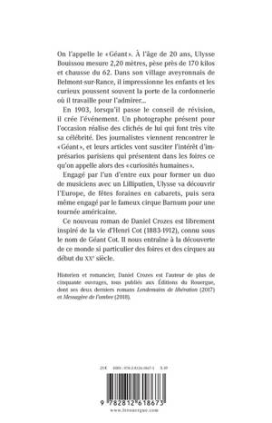 A 20 ans, Ulysse Bouissou mesure 2,20 mètres ! Lorsqu'il se présente en 1903 au conseil de révision, les photos prises de lui déclenchent rapidement sa célébrité. Engagé par un imprésario, il forme un duo de musiciens avec un lilliputien. Ensemble ils vont découvrir l'Europe, de fêtes foraines en cabarets, puis l'Amérique, avec le fameux cirque Barnum. Un roman librement inspiré de la vie du "Géant Cot".