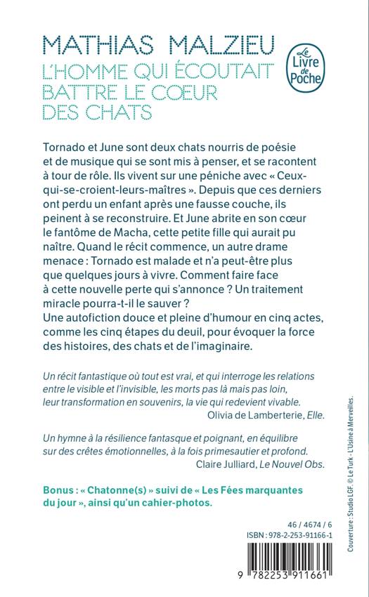 Tornado et June sont deux chats nourris de poésie et de musique qui se sont mis à penser, et se racontent à tour de rôle. Ils vivent sur une péniche avec « Ceux-qui-se-croient-leurs-maîtres ». Depuis que ces derniers ont perdu un enfant après une fausse couche, ils peinent à se reconstruire. Et June abrite en son cœur le fantôme de Macha, cette petite fille qui aurait pu naître. Quand le récit commence, un autre drame menace : Tornado est malade et n’a peut-être plus que quelques jours à vivre. Comment faire face à cette nouvelle perte qui s’annonce ? Un traitement miracle pourra-t-il le sauver ?