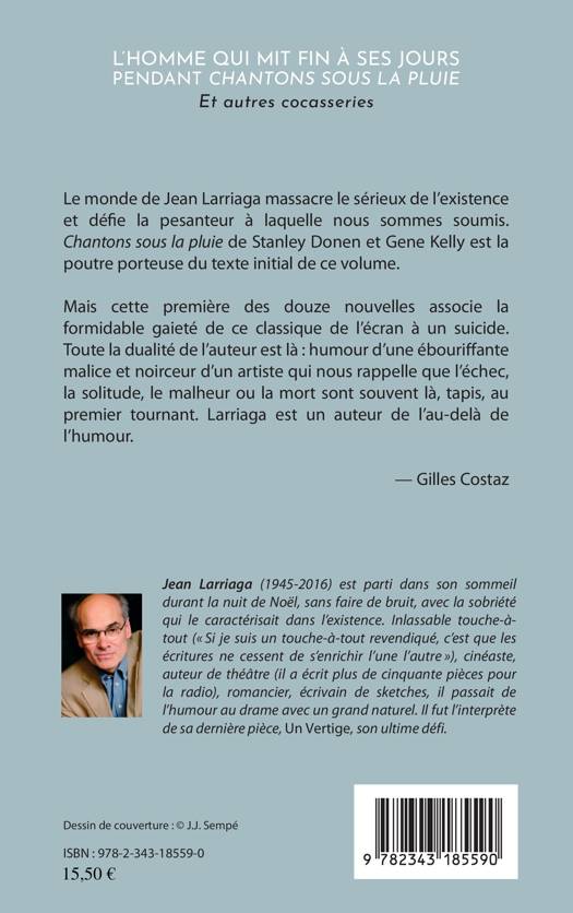 Le monde de Jean Larriaga massacre le sérieux de l'existence et défie la pesanteur à laquelle nous sommes soumis. "Chantons sous la pluie" est la poutre porteuse de la première des douze nouvelles ici éditées, qui associe la formidable gaieté de ce classique de l'écran à un suicide.