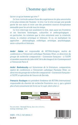 Qu'est-ce qu'un homme qui rêve ? Ce livre s'articule autour d'une des expériences les plus ancestrales et les plus intimes de l'homme : le rêve. Car le rêve occupe une grande partie de nos nuits et reste une des premières sources d'inspiration immuable pour les arts de tous les temps. Ce livre interroge non seulement le rêve, mais aussi ses frontières et ses fonctions historiques, culturelles et anthropologiques ; en particulier, les relations que le rêve entretient avec la créativité.