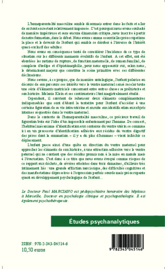 Pour combler le peu d'études dans l'approche de l'homoparentalité masculine, l'auteur de cette étude propose d'ouvrir un champ de réflexion axé sur le développement de l'enfant. Il interroge notamment la relation de celui-ci au ventre du père en l'absence de ventre maternel, en mobilisant les notions de rupture, de fonction maternelle, de roman familial, de complexe d'Oedipe et d'épistémophilie.