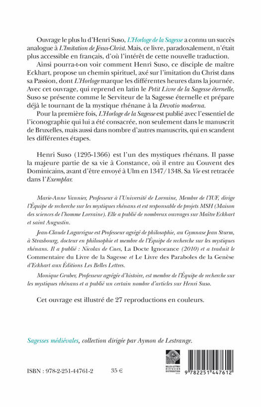 Ouvrage le plus lu d'Henri Suso, L'Horloge de la Sagesse a connu un succes analogue a L'imitation de Jesus-Christ. Mais, ce livre, paradoxalement, n'etait plus accessible en francais, d'ou l'interet de cette nouvelle traduction. Ainsi pourra-t-on voir comment Henri Suso, ce disciple de maitre Eckhart, propose un chemin spirituel, axe sur l'imitation du Christ dans sa Passion, dont L'horloge marque les differentes heures dans la journee. Avec cet ouvrage, qui reprend en latin le Petit Livre de la Sagesse eternelle, Suso se presente comme le Serviteur de la Sagesse eternelle et prepare deja le tournant de la mystique rhenane a la Devotio moderna. Pour la premiere fois, L'Horloge de la Sagesse est publie avec l'essentiel de l'iconographie qui lui a ete consacree, non seulement dans le manuscrit de Bruxelles, mais aussi dans nombre d'autres manuscrits, qui en scandent les differentes etapes.