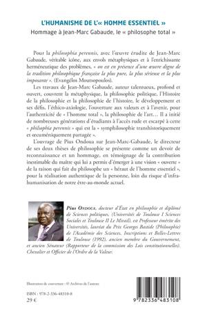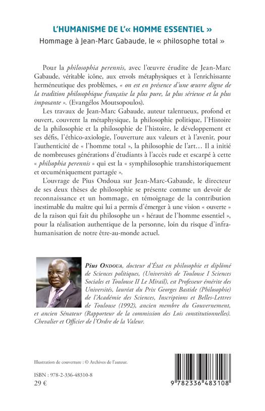 Pour la philosophia perennis, avec l’œuvre érudite de Jean-Marc Gabaude, véritable icône, aux envols métaphysiques et à l’enrichissante herméneutique des problèmes, « on est en présence d’une œuvre digne de la tradition philosophique française la plus pure, la plus sérieuse et la plus imposante ». (Evangélos Moutsopoulos). Les travaux de Jean-Marc Gabaude, auteur talentueux, profond et ouvert, couvrent la métaphysique, la philosophie politique, l’Histoire de la philosophie et la philosophie de l’histoire, le développement et ses défis, l’éthico-axiologie, l’ouverture aux valeurs et à l’avenir, pour l’authenticité de « l’homme total », la philosophie de l’art… Il a initié de nombreuses générations d’étudiants à l’accès rude et escarpé à cette « philsophia perennis » qui est la « symphilosophie transhistoriquement et œcuméniquement partagée ». L’ouvrage de Pius Ondoua sur Jean-Marc-Gabaude, le directeur de ses deux thèses de philosophie se présente comme un devoir de reconnaissance et un hommage, en témoignage de la contribution inestimable du maître qui lui a permis d’émerger à une vision « ouverte » de la raison qui fait du philosophe un « héraut de l’homme essentiel », pour la réalisation authentique de la personne, loin du risque d’infra-humanisation de notre être-au-monde actuel.