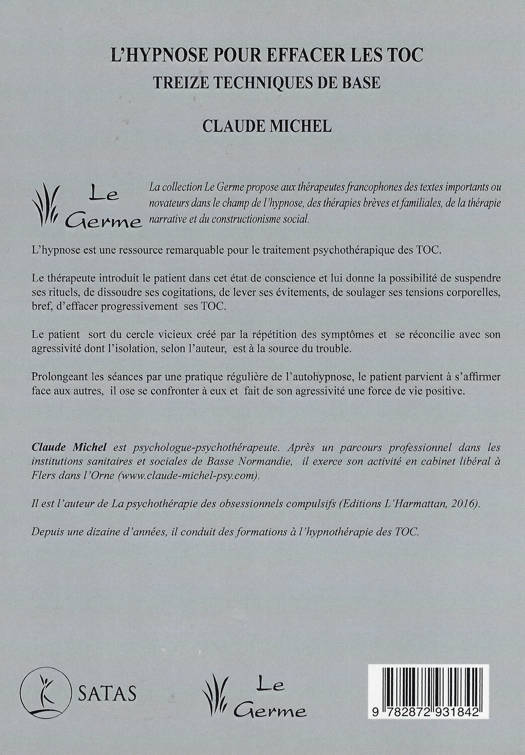 L'hypnose est une ressource remarquable pour le traitement psychothérapique des TOC. Le thérapeute introduit le patient dans cet état de conscience et lui donne la possibilité de suspendre ses rituels, de dissoudre ses cogitations, de lever ses évitements, de soulager ses tensions corporelles, bref, d'effacer progressivement ses TOC. Le patient sort du cercle vicieux créé par la répétition des symptômes et se réconcilie avec son agressivité dont l'isolation, selon l'auteur, est à la source du trouble. Prolongeant les séances par une pratique régulière de l'autohypnose, le patient parvient à s'affirmer face aux autres, il ose se confronter à eux et fait de son agressivité une force de vie positive.