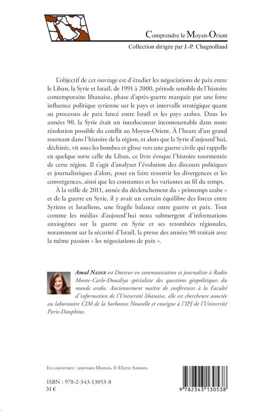 L'objectif de cet ouvrage est d'étudier les négociations de paix entre le Liban, la Syrie et Israël de 1991 à 2000, période sensible de l'histoire contemporaine libanaise, marquée par une forte influence politique syrienne sur le pays et intervalle stratégique quant au processus de paix lancé entre Israël et les pays arabes. A l'heure d'un grand bouleversement de cette zone depuis le déclenchement des printemps arabes, ce livre évoque l'histoire tourmentée de la région en analysant l'évolution des discours politiques et journalistiques de cette décennie.