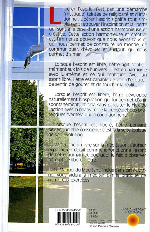 Libérer l’esprit n’est pas une démarche « mystique » teintée de religiosité et d’irrationnel. Libérer l’esprit signifie tout simplement retrouver l’inspiration et la liberté qui sont à la base d’une action harmonieuse et créative. Cette action harmonieuse et créative est l’immense pouvoir que nous avons tous et qui nous permet de construire un monde, de communiquer, d’évoluer et surtout, qui nous permet d’aimer. Lorsque l’esprit est libre, l’être agit conformément aux lois de l’univers : il est en harmonie avec lui-même et ce qui l’entoure. Avec un esprit libre, l’être est capable de voir, d’écouter, de sentir, de goûter et de toucher la réalité. Lorsque l’esprit est libéré, l’être développe naturellement l’inspiration qui lui permet d’agir spontanément, et cela sans parasiter le flux de l’action avec la relativité de la pensée et des prétendues « vérités » qui la conditionnent. Lorsque l’esprit est libéré, l’être pensant devient un être conscient : c’est là la suite logique de son évolution. Voici donc un livre sur la méditation. L’auteur explique en détail comment fonctionne l’esprit de l’être humain et pourquoi le fait d’observer permet de libérer l’être. « Le Manuel du Méditant », inclus dans cet ouvrage, vous aidera à méditer par la pratique de nombreux exercices.