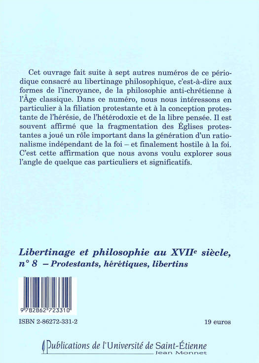 Cet ouvrage fait suite à sept autres numéros de ce périodique consacré au libertinage philosophique, c'est-à-dire aux formes de l'incroyance, de la philosophie anti-chrétienne à l'Âge classique. Dans ce numéro, nous nous intéressons en particulier à la filiation protestante et à la conception protestante de l'hérésie, de l'hétérodoxie et de la libre pensée. Il est souvent affirmé que la fragmentation des Églises protestantes a joué un rôle important dans la génération d'un rationalisme indépendant de la foi - et finalement hostile à la foi.