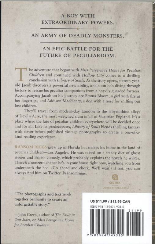 The New York Times #1 best-selling series To find their friends, Jacob, Emma, and Addison go to Devil's Acre, a crime-ridden Victorian underworld, but they uncover an operation far more sinister than they imagined . . . In Victorian England, Jacob discovers the Library of Souls, a hidden collection that holds the key to saving his peculiar friends and the entire peculiar world. Inside the library, he encounters a ymbryne, a powerful ancient creature who possesses the ability to control time and manipulate souls.