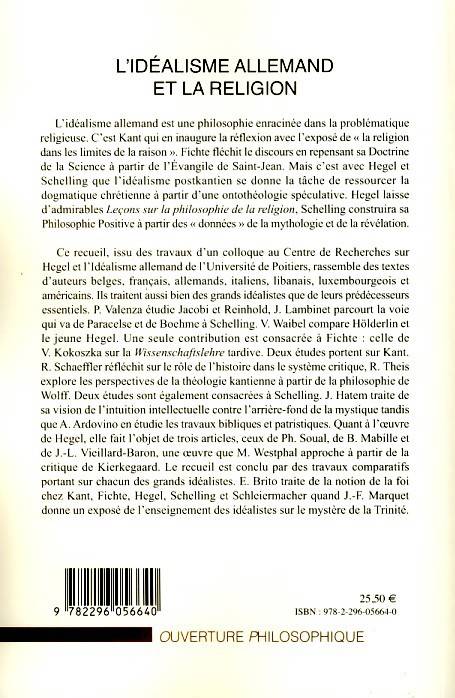 L'idéalisme allemand s'enracine dans la problématique religieuse : Kant, d'abord, qui expose "la religion dans les limites de la raison", puis Fichte, qui repense sa Doctrine de la Science à partir de l'Evangile de Jean. Avec Hegel et Schelling, enfin, l'idéalisme postkantien se donne la tâche de ressourcer la dogmatique chrétienne à partir d'une ontothéologie spéculative.