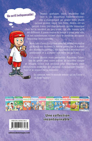 Depuis quelques mois, Madeline fait face à un important bouleversement : elle a maintenant un grand frère plutôt qu’une grande sœur. Son frère, Alexis, est un garçon trans. Les changements qu’elle remarque chez lui la rendent un peu triste, car elle trouve qu’il est différent. Il passe moins de temps à jouer avec elle, et ses nombreuses visites chez le médecin occupent beaucoup leurs parents. Mais lors d’une discussion avec lui, Madeline réalise qu’Alexis est toujours la même personne. À travers des moments partagés, elle apprend à exprimer ses sentiments et à accepter son frère tel qu’il est. Ce conte illustré vous permettra d’aborder l’identité de genre avec votre enfant de manière simple et imagée. Grâce aux sections plus théoriques, vous découvrirez ensemble des moyens d’encourager l’ouverture et le respect de la diversité. En somme, chacun mérite d’être aimé pour qui il est vraiment !
