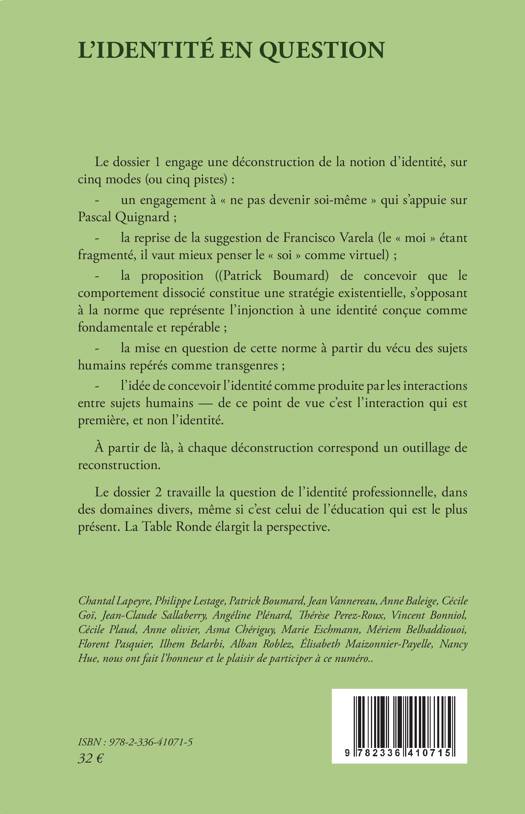 Le dossier 1 engage une déconstruction de la notion d'identité, sur cinq modes (ou cinq pistes): - un engagement à ne pas devenir soi-même qui s'appuie sur Pascal Quignard; - la reprise de la suggestion de Francisco Varela (le moi étant fragmenté, il vaut mieux penser le soi comme virtuel); - la proposition ((Patrick Boumard) de concevoir que le comportement dissocié constitue une stratégie existentielle, s'opposant à la norme que représente l'injonction à une identité conçue comme fondamentale et repérable; - la mise en question de cette norme à partir du vécu des sujets humains repérés comme transgenres; - l'idée de concevoir l'identité comme produite par les interactions entre sujets humains - de ce point de vue c'est l'interaction qui est première, et non l'identité. À partir de là, à chaque déconstruction correspond un outillage de reconstruction. Le dossier 2 travaille la question de l'identité professionnelle, dans des domaines divers, même si c'est celui de l'éducation qui est le plus présent. La Table Ronde élargit la perspective.