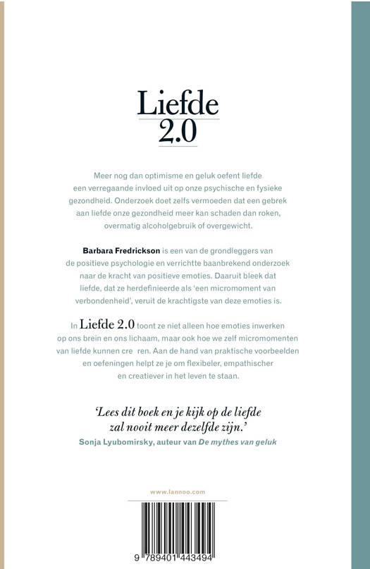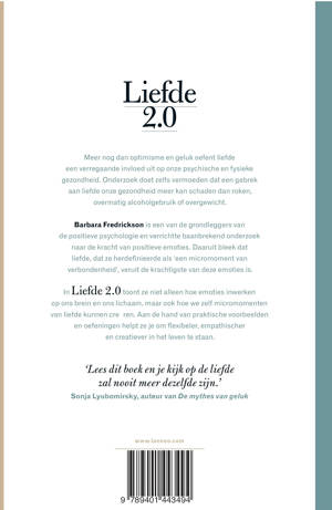 Een verrassende kijk op de liefde vanuit een biologisch perspectief Meer nog dan optimisme en geluk oefent liefde een verregaande invloed uit op onze psychische en fysieke gezondheid. Barbara Fredrickson verrichtte baanbrekend onderzoek naar de kracht van positieve emoties. Daaruit bleek dat liefde, dat ze herdefinieerde als 'een micromoment van verbondenheid', veruit de krachtigstige van deze emoties is. In Liefde 2.0 toont ze niet alleen hoe emoties inwerken op ons brein en ons lichaam, maar ook hoe we zelf micromomenten van liefde kunnen creëren en hoe deze je flexibeler, empathischer en creatiever kunnen maken.