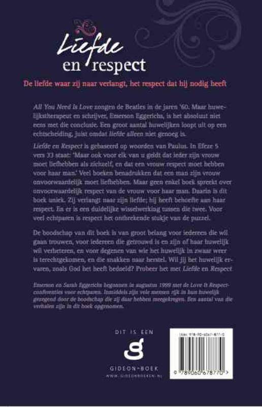 All You Need Is Love zongen de Beatles in de jaren 60. Maar huwelijkstherapeut en schrijver, Emerson Eggerichs, is het absoluut niet eens met die conclusie. Een groot aantal huwelijken loopt uit op een echtscheiding, juist omdat liefde alleen niet genoeg is. Liefde en Respect is gebaseerd op woorden van Paulus. In Efeze 5 vers 33 staat: Maar ook voor elk van u geldt dat ieder zijn vrouw moet liefhebben als zichzelf, en dat een vrouw respect moet hebben voor haar man. Veel boeken benadrukken dat een man zijn vrouw onvoorwaardelijk moet liefhebben. Maar geen enkel boek spreekt over onvoorwaardelijk respect van de vrouw voor haar man. Daarin is dit boek uniek. Zij verlangt naar zijn liefde; hij heeft behoefte aan haar respect. En er is een duidelijke wisselwerking tussen die twee. Voor veel echtparen is respect het ontbrekende stukje van de puzzel. De boodschap van dit boek is van groot belang voor iedereen die wil gaan trouwen, voor iedereen die getrouwd is en zijn of haar huwelijk wil verbeteren, en voor degenen van wie het huwelijk in zwaar weer is terechtgekomen, en die snakken naar herstel. Wil jij het huwelijk ervaren, zoals God het heeft bedoeld? Probeer het met Liefde en Respect.