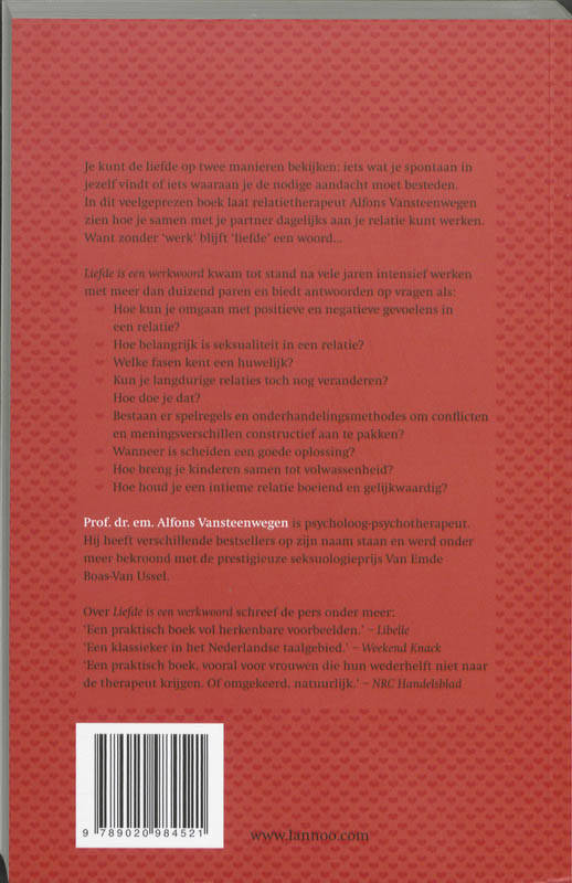 Een onverwoestbare klassieker voor al wie een leven lang wil werken aan zijn of haar relatie In dit boek richt de auteur zich tot partners die samen-leven. Hij tracht hen te helpen hun relatie te verbeteren. Daartoe biedt hij een aantal bruikbare opvattingen omtrent relaties en hij illustreert zijn visie met veel herkenbare voorbeelden uit de praktijk van elke dag. Liefde is een werkwoord is tot stand gekomen na vijfentwintig jaar lang intensief werken met meer dan duizend paren. De volgende thema's komen aan bod: - Hoe kan men omgaan met positieve en negatieve gevoelens in een relatie? - Wat is het belang van seksualiteit in een samenlevingsrelatie? - Welke zijn de fasen in een huwelijk? - Is het mogelijk langdurige relaties toch nog te veranderen? Zo ja, op welke manier? - Bestaan er spelregels en onderhandelingsmethodes voor het constructief aanpakken van conflicten en meningsverschillen? - Wanneer is scheiden een goede oplossing? - Hoe kan men als partners in deze tijd kinderen brengen tot volwassenheid? - Welke zijn de voorwaarden om de intieme relatie boeiend en gelijkwaardig te houden?