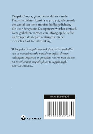 Liefdesgedichten Achthonderd jaar geleden werd de grote Perzische soefidichter en mysticus Rumi geboren. In Turkije wordt deze 'meester-alchemist van de liefde' vereerd als een nationale held en in de Verenigde Staten geldt hij als de meest gelezen dichter. Deepak Chopra, een groot bewonderaar van Rumi, selecteerde een aantal van diens mooiste liefdesgedichten, die door Fereydoun Kia opnieuw werden vertaald. Zij vormen een lofzang op de liefde en brengen de diepste verlangens van het menselijk hart dat op zoek is naar het goddelijke, tot uitdrukking. Elke poëtische fluistering is een getuigenis van de hartstocht die menselijke relaties doordringt. 'Ik hoop dat deze gedichten ook de lezer iets onthullen van de wonderbaarlijke wereld van liefde, dromen, verlangens, begeerten en gevoelens van een man die ons, na zoveel eeuwen, nog steeds weet te verbazen en te verwarren en die ons nog altijd iets te zeggen heeft.' Deepak Chopra