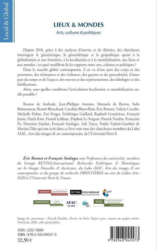 Depuis 2010 des chercheurs interrogent le géoartistique, la géoesthétique et la géopolitique quant à la globalisation et aux frontières, à la localisation et à la mondialisation : en quoi modifient-ils les rapports entre arts, cultures et politiques ? Dans le marché global contemporain, il en va d'une part des corps et des personnes, des résistances et des violences, d'autre part du temps et de l'espace, des uvres et des représentations. Alors, sous quelles conditions l'articulation localisation et mondialisation est-elle possible ?