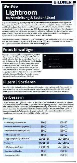 Diese Kurzanleitung enthält die wichtigsten Informationen zur RAW-Entwicklung in Lightroom. Die praktische Faltkarte enthält unter anderem Anleitungen zu den folgenden Bereichen: Fotos hinzufügen, filtern, sortieren und verbessern. Fotos organisieren, löschen, anzeigen, bewerten und veröffentlichen. Wichtige Voreinstellungen, Presets, Profile, Farbmischung und Farbkorrektur. Außerdem die wichtigsten Tastaturkürzel zum Anzeigen/Bearbeiten, Auswählen und Bewerten auf einen Blick.