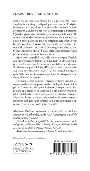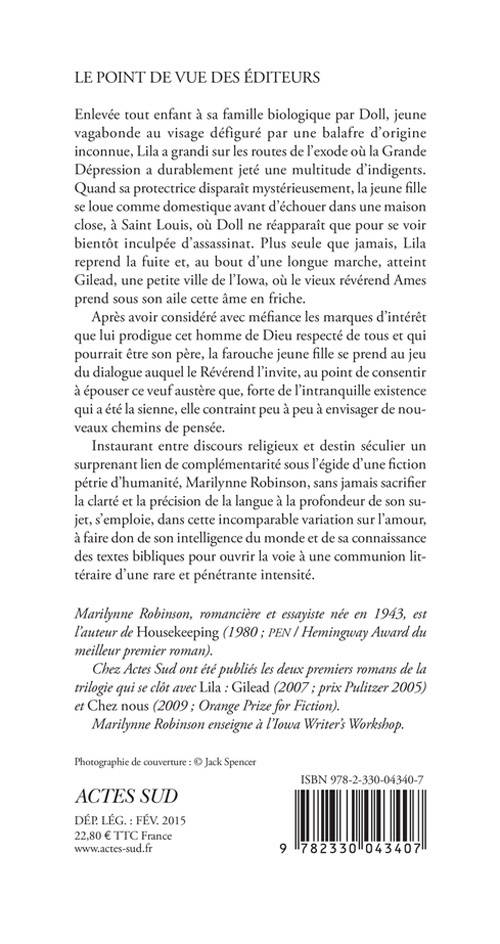 Enlevée tout enfant à sa famille biologique par Doll, jeune vagabonde au visage défiguré par une balafre d'origine inconnue, Lila a grandi sur les routes de l'exode où la Grande Dépression a durablement jeté une multitude d'indigents. Quand sa protectrice disparaît mystérieusement, la jeune fille se loue comme domestique avant d'échouer dans une maison close, à Saint Louis, où Doll ne réapparaît que pour se voir bientôt inculpée d'assassinat. Plus seule que jamais, Lila reprend la fuite et, au bout d'une longue marche, atteint Gilead, une petite ville de l'Iowa, où le vieux révérend Ames prend sous son aile cette âme en friche.