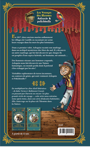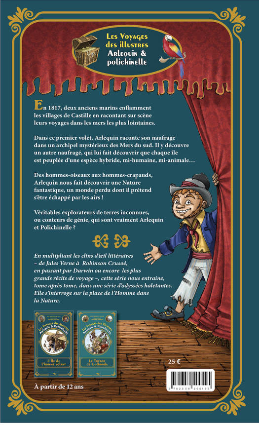 Inspiré par les récits de voyages en mer du XVIIIe et XIXe mais aussi par les plus célèbres romans d'aventures (Jules Verne, Daniel Defoe, Stevenson), ce roman de Jean-Sébastien Blanck, illustré par Jonathan Bousmar, nous plonge dans un fabuleux voyage autour du monde à la fin du XVIIIe. Mêlant l'aventure, l'exotisme et l'extravagance d'un baron de Munchausen, le narrateur raconte son odyssée et son naufrage sur une île peuplée de créatures hybrides, mi humaines, mi animales. Ce livre de 168 pages illustrées constitue le premier volet d'une série "Les Voyages des illustres Arlequin et Polichinelle. Le second volet, Le Trésor de Golkonda, paraitra en mars 2027. Tous deux peuvent être lus par un lecteur dès 11 ans. Chaque volume, au format des romans de la collection Hetzel, est relié et doré sur tranche, à la manière des beaux livres du XIXe.