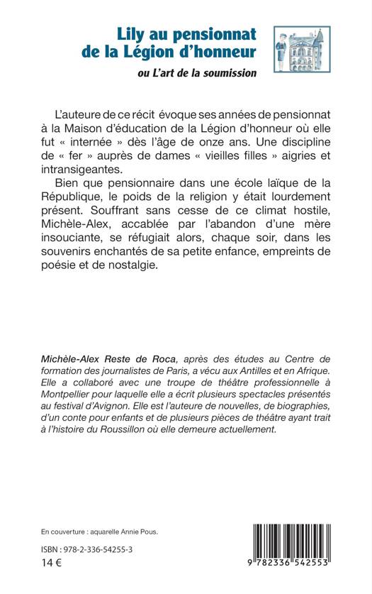 L'auteure de ce récit évoque ses années de pensionnat à la Maison d'éducation de la Légion d'honneur où elle fut internée dès l'âge de onze ans. Une discipline de fer auprès de dames vieilles filles aigries et intransigeantes. Bien que pensionnaire dans une école laïque de la République, le poids de la religion y était lourdement présent. Souffrant sans cesse de ce climat hostile, Michèle-Alex, accablée par l'abandon d'une mère insouciante, se réfugiait alors, chaque soir, dans les souvenirs enchantés de sa petite enfance, empreints de poésie et de nostalgie.