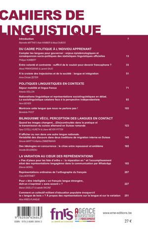 Contributions de sociolinguistique abordant notamment la question des accents, régionaux ou étrangers, les idéologies langagières dans un contexte de globalisation et de flux migratoires croissants, le bilinguisme vécu et la perception des langues en contact ou encore l'impact des développement technologiques sur les pratiques langagières.