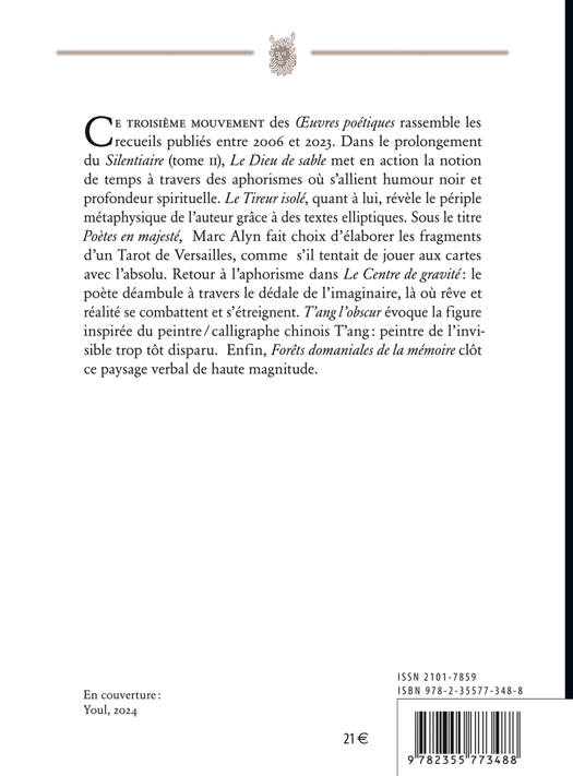 LE CONTENU. Sous le titre L’Image, la Magie (2004 – 2023), le Tome 3 des Œuvres Poétiques de Marc Alyn contient la réédition intégrale des ouvrages suivants :– Le Dieu de sable et autres textes, Phi / Écrits des Forges, 2006 ;– Le Tireur isolé, PHI, 2010 ;– Poètes en majesté à Versailles, préface de Denis Podalydès, éditions des Busclats, 2013 ;– Proses de l’intérieur du poème, Le Castor astral, 2015 ;– Le Centre de gravité, Le Grand Tétras, 2017 ;– T’ang l’obscur, Voix d’Encre, 2019 ;– Forêts domaniales de la mémoire, La rumeur libre, 2023.Le Tome 3 est introduit par un texte de Pierre Brunel, Palpitation et plénitude du poème