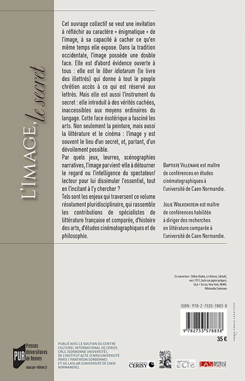 Cet ouvrage collectif se veut une invitation à réfléchir au caractère « énigmatique » de l’image, à sa capacité à cacher ce qu’en même temps elle expose. Dans la tradition occidentale, l’image possède une double face. Elle est d’abord évidence ouverte à tous : elle est le liber idiotarum (le livre des illettrés) qui donne à tout le peuple chrétien accès à ce qui est réservé aux lettrés. Mais elle est aussi l’instrument du secret : elle introduit à des vérités cachées, inaccessibles aux moyens ordinaires du langage. Cette face ésotérique a fasciné les arts. Non seulement la peinture, mais aussi la littérature et le cinéma : l’image y est souvent le lieu d’un secret, et, partant, d’un dévoilement possible. Par quels jeux, leurres, scénographies narratives, l’image parvient-elle à détourner le regard ou l’intelligence du spectateur/lecteur pour lui dissimuler l’essentiel, tout en l’incitant à l’y chercher ? Tels sont les enjeux qui traversent ce volume résolument pluridisciplinaire, qui rassemble les contributions de spécialistes de littérature française et comparée, d’histoire des arts, d’études cinématographiques et de philosophie.