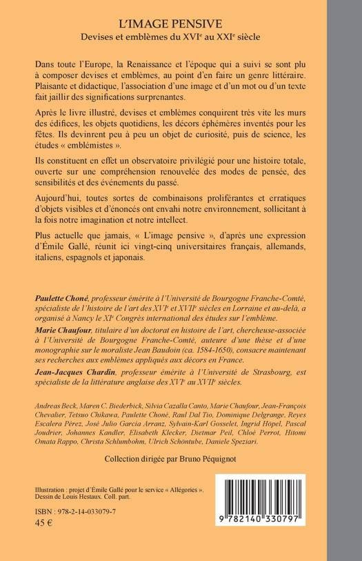 Dans toute l'Europe, la Renaissance et l'époque qui a suivi se sont plu à composer devises et emblèmes, au point d'en faire un genre littéraire. Plaisante et didactique, l'association d'une image et d'un mot ou d'un texte fait jaillir des significations surprenantes. Après le livre illustré, devises et emblèmes conquirent très vite les murs des édifices, les objets quotidiens, les décors éphémères inventés pour les fêtes. Ils devinrent peu à peu un objet de curiosité, puis de science, les études emblémistes . Ils constituent en effet un observatoire privilégié pour une histoire totale, ouverte sur une compréhension renouvelée des modes de pensée, des sensibilités et des événements du passé. Aujourd'hui, toutes sortes de combinaisons proliférantes et erratiques d'objets visibles et d'énoncés ont envahi notre environnement, sollicitant à la fois notre imagination et notre intellect. Plus actuelle que jamais, L'image pensive, d'après une expression d'Émile Gallé, réunit ici vingt-cinq universitaires français, allemands, italiens, espagnols et japonais.