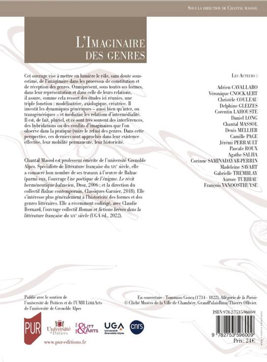 Cet ouvrage vise à mettre en lumière le rôle, sans doute sous-estimé, de l’imaginaire dans les processus de constitution et de réception des genres. Omniprésent, sous toutes ses formes, dans leur représentation et dans celle de leurs relations, il assure, comme cela ressort des études ici réunies, une triple fonction : modélisatrice, axiologique, créatrice. Il investit les dynamiques génériques – aussi bien qu’inter, ou transgénériques – et médiatise les relations d’intermédialité. Il est, de fait, pluriel, et ce sont très souvent des interférences, des hybridations ou des conflits d’imaginaires que l’on observe dans la pratique (voire le refus) des genres. Dans cette perspective, ces derniers sont approchés dans leur existence effective, leur mobilité permanente, leur historicité.