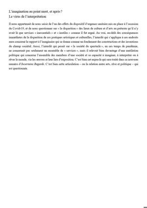 Liée au dispositif sanitaire (Covid 19), la « disparition » des lieux de culture et d'arts, peut être perçue comme un interdit qui ne concernait pas que des « services », mais relevait d'une mutilation politique qui concerne l'ensemble des membres d'une société et sa capacité à imaginer, à interpréter ou à rêver.
