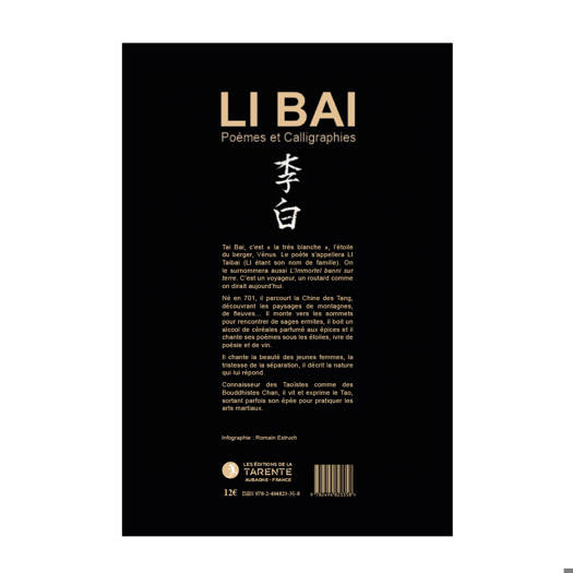 Tai Bai, c’est « la très blanche », l’étoile du berger, Vénus. Le poète s’appellera LI Taibai (LI étant son nom de famille). On le surnommera aussi L’Immortel banni sur terre. C’est un voyageur, un routard comme on dirait aujourd’hui. Né en 701, il parcourt la Chine des Tang, découvrant les paysages de montagnes, de fleuves… Il monte vers les sommets pour rencontrer de sages ermites, il boit un alcool de céréales parfumé aux épices et il chante ses poèmes sous les étoiles, ivre de poésie et de vin. Il chante la beauté des jeunes femmes, la tristesse de la séparation, il décrit la nature qui lui répond. Connaisseur des Taoïstes comme des Bouddhistes Chan, il vit et exprime le Tao, sortant parfois son épée pour pratiquer les arts martiaux.